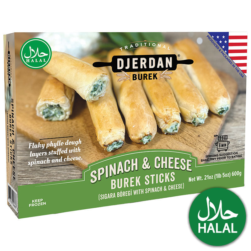 Burek Spinach & Cheese Sticks are rolled-up sticks filled with spinach and cheese from Djerdan. Crispy phyllo sticks filled with spinach and feta cheese, a classic Balkan savory snack.